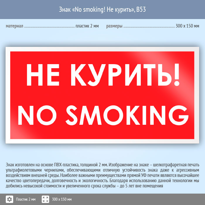 Знак «No smoking! Не курить», B53 (пластик, 300х150 мм) в Пушкино купить