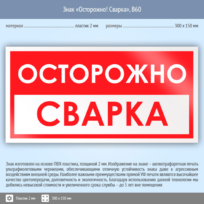 Знак «Осторожно! Сварка», B60 (пластик, 300х150 мм) в Пушкино купить