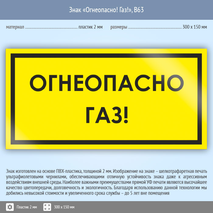 Знак «Огнеопасно! Газ!», B63 (пластик, 300х150 мм) в Пушкино купить
