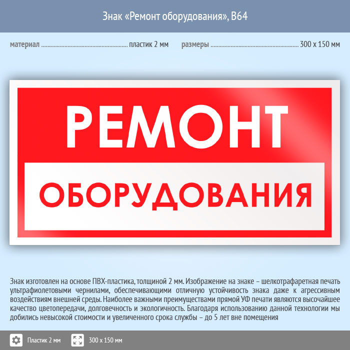 Знак «Ремонт оборудования», B64 (пластик, 300х150 мм) в Пушкино купить