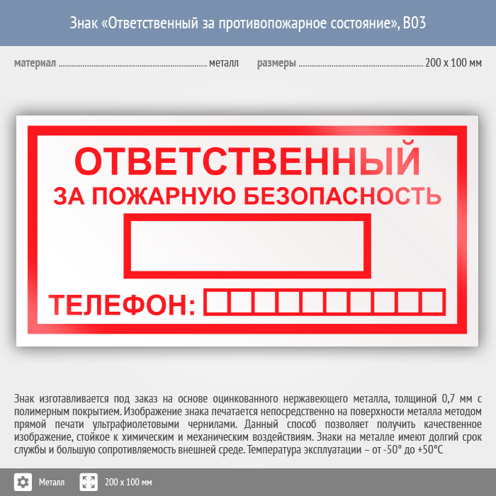 Знак «Ответственный за пожарную безопасность», B03 (металл, 200х100 мм) в Пушкино купить