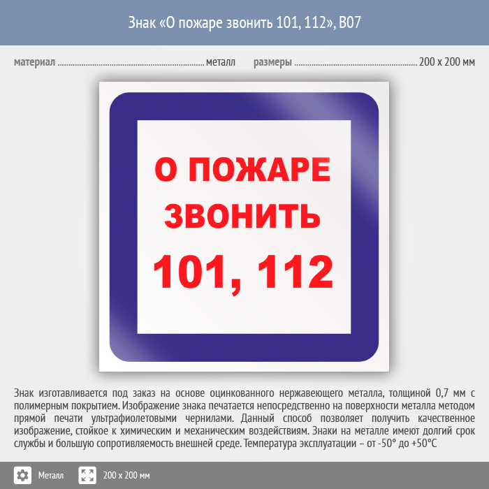 Знак «О пожаре звонить 101, 112», B07 (металл, 200х200 мм) в Пушкино купить