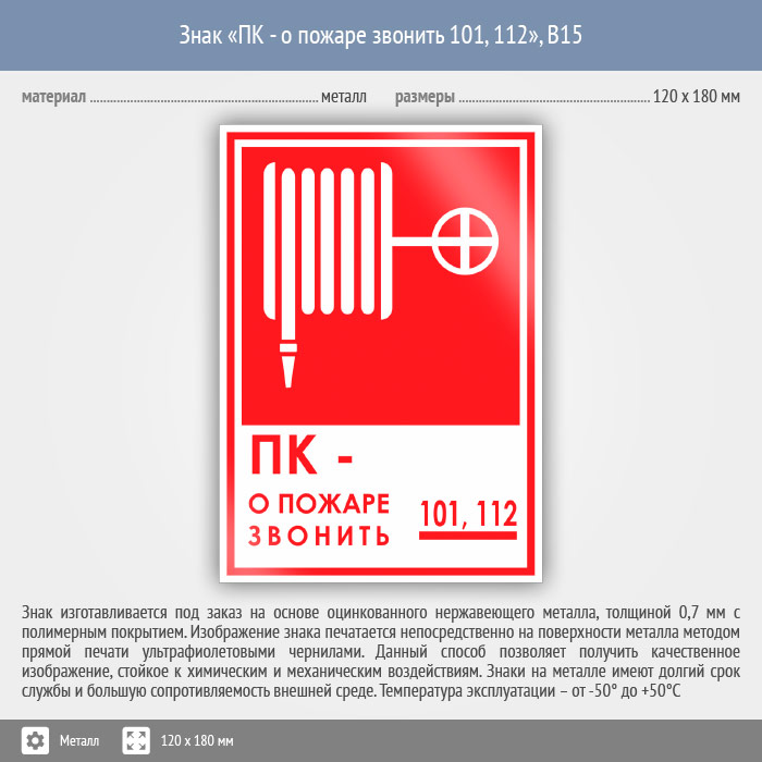 Знак «ПК - о пожаре звонить 101, 112», B15 (металл, 120х180 мм) в Пушкино купить