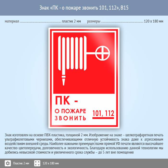 Знак «ПК - о пожаре звонить 101, 112», B15 (пластик, 120х180 мм) в Пушкино купить