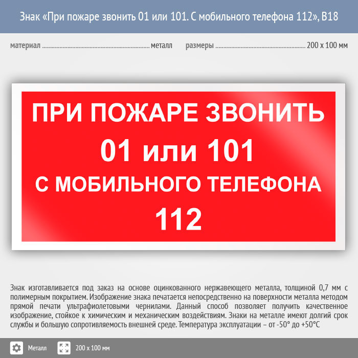 Знак «При пожаре звонить 01 или 101. С мобильного телефона 112», B18 (металл, 200х100 мм) в Пушкино купить