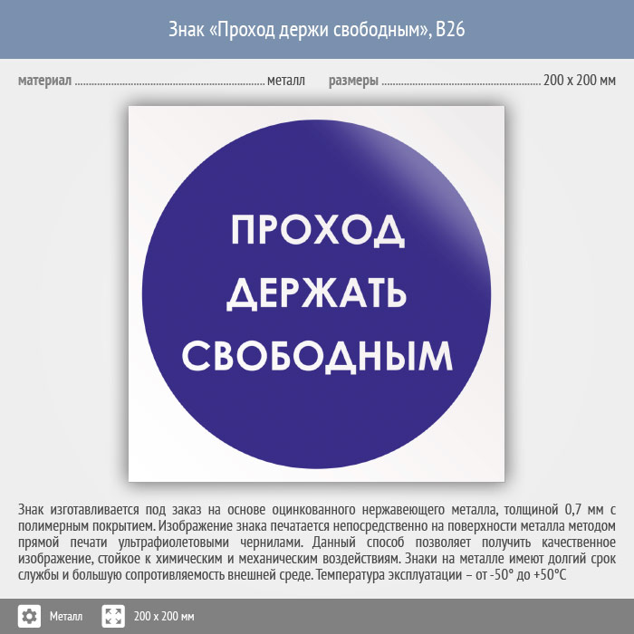 Знак «Проход держи свободным», B26 (металл, 200х200 мм) в Пушкино купить