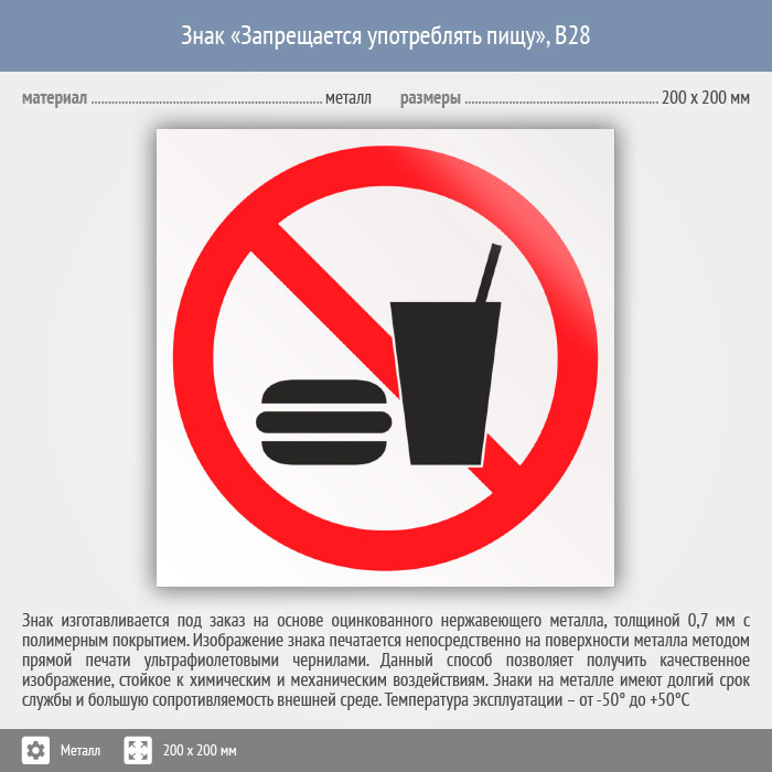 Знак «Запрещается употреблять пищу», B28 (металл, 200х200 мм) в Пушкино купить
