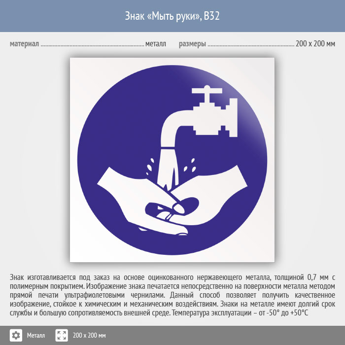 Знак «Мыть руки», B32 (металл, 200х200 мм) в Пушкино купить