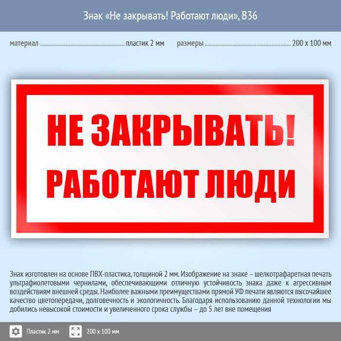 Знак «Не закрывать! Работают люди», B36 (пластик, 200х100 мм) в Пушкино купить