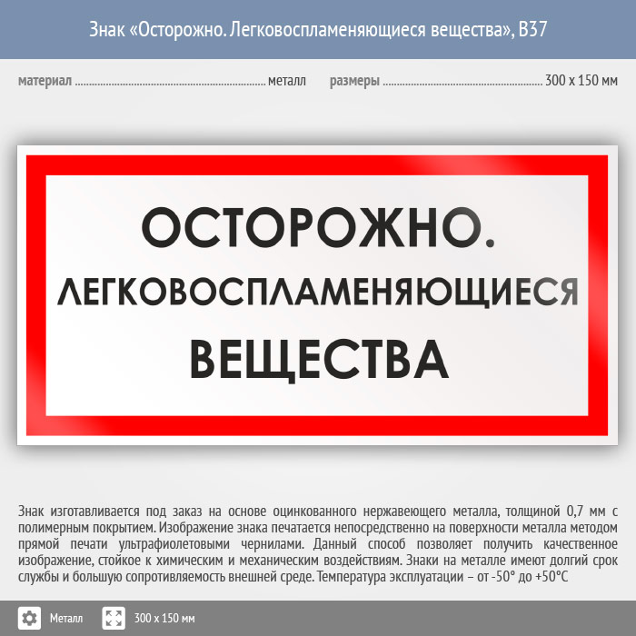 Знак «Осторожно. Легковоспламеняющиеся вещества», B37 (металл, 300х150 мм) в Пушкино купить