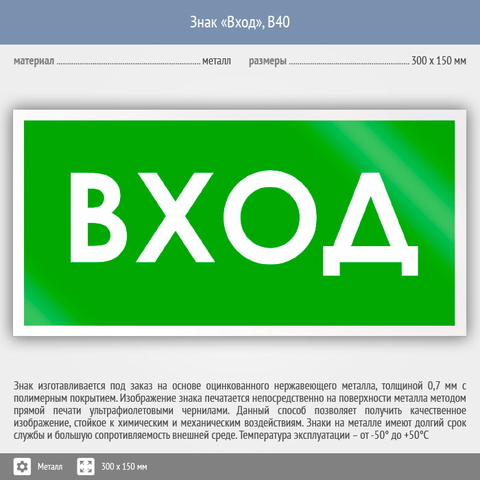 Знак «Вход», B40 (металл, 300х150 мм) в Пушкино купить