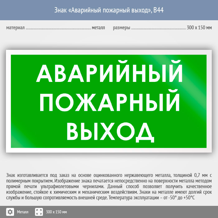 Знак «Аварийный пожарный выход», B44 (металл, 300х150 мм) в Пушкино купить