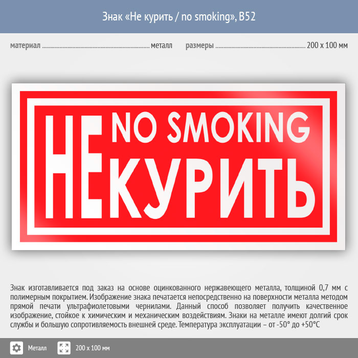 Знак «Не курить / no smoking», B52 (металл, 200х100 мм) в Пушкино купить