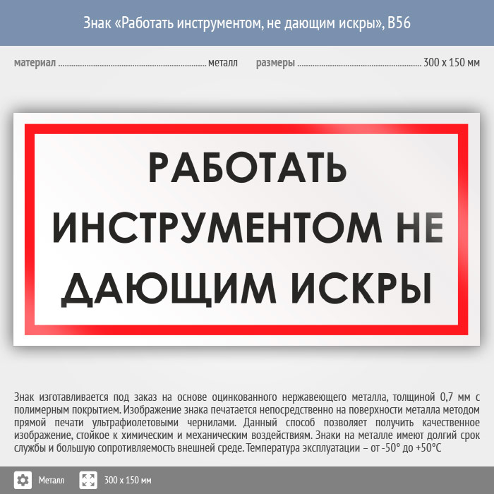 Знак «Работать инструментом, не дающим искры», B56 (металл, 300х150 мм) в Пушкино купить