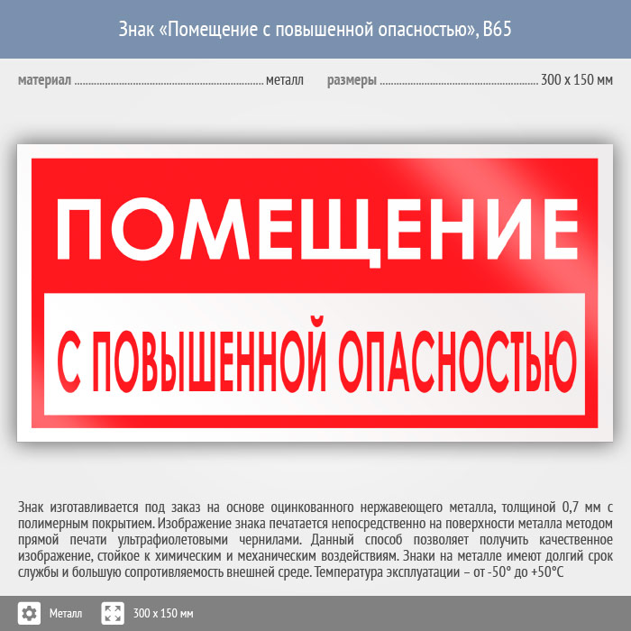 Знак «Помещение с повышенной опасностью», B65 (металл, 300х150 мм) в Пушкино купить