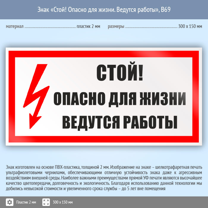Знак «Стой! Опасно для жизни. Ведутся работы», B69 (пластик, 300х150 мм) в Пушкино купить