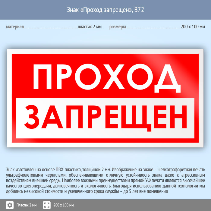 Знак «Проход запрещен», B72 (пластик, 200х100 мм) в Пушкино купить