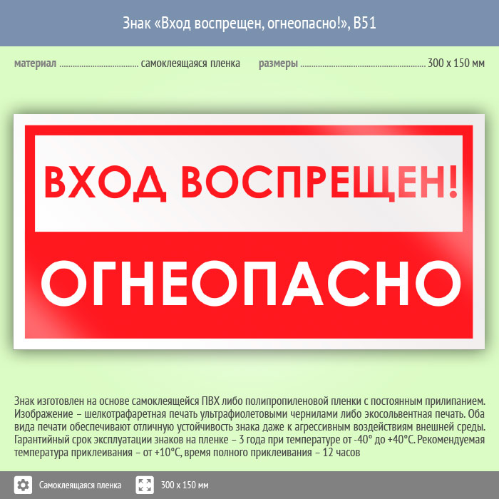 Знак «Вход воспрещен, огнеопасно!» имеет размер 300х150 мм