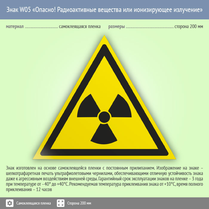 Знак «Опасно! Радиоактивные вещества или ионизирующее излучение» предупреждает о радиоактивной опасности. Код знака: W05