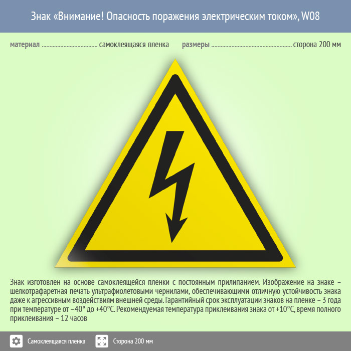 Знак W08 «Внимание! Опасность поражения электрическим током» (фотолюм. пленка ГОСТ, сторона 150 мм)