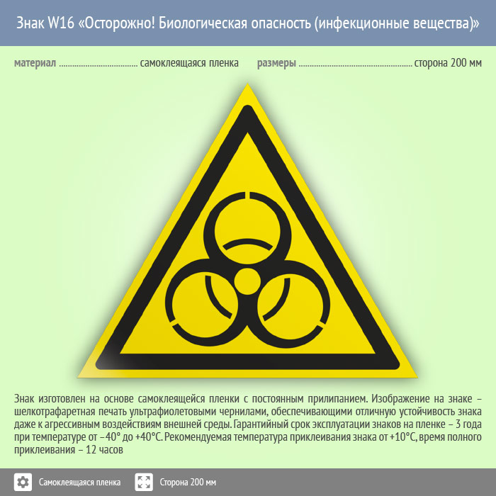 Знак W16 «Осторожно! биологическая опасность (инфекционные вещества)» (пленка, сторона 200 мм)