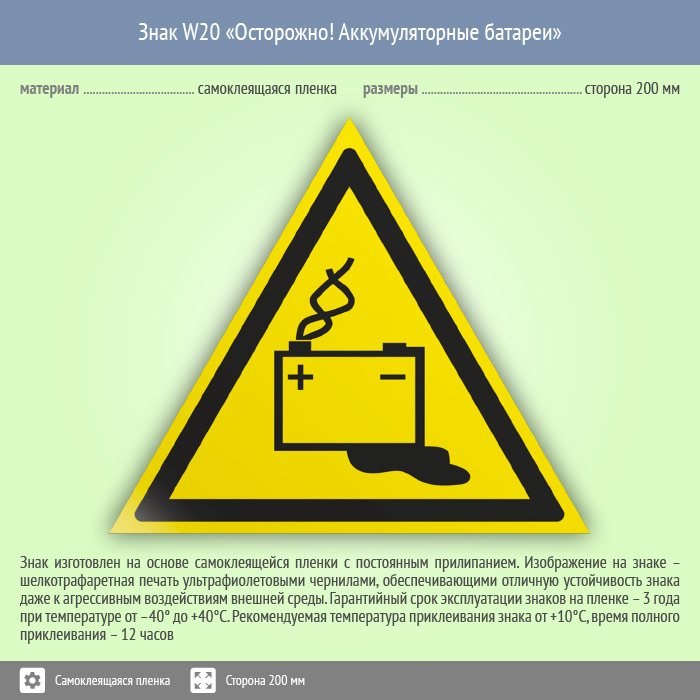 Знак W20 «Осторожно! Аккумуляторные батареи»