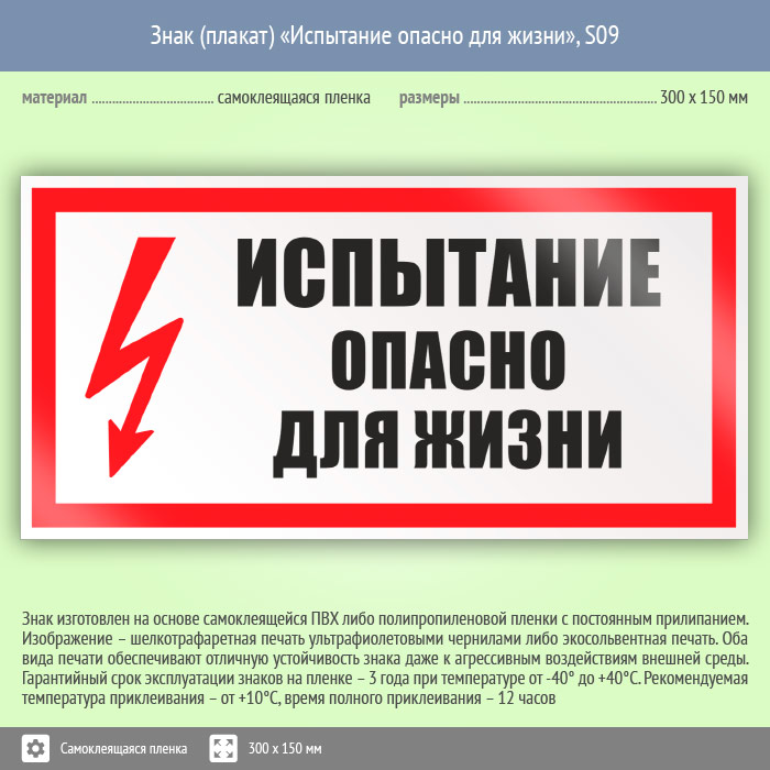 Знак (плакат) «Испытание опасно для жизни», S09 (пленка, 300х150 мм) в Пушкино купить