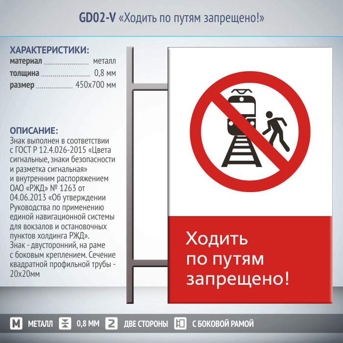 Знак «Ходить по путям запрещено!», GD02-V (двусторонний вертикальный, 450х700 мм, металл, на раме с боковым креплением) в Пушкино купить