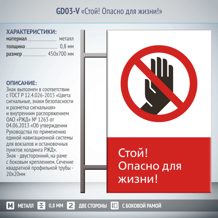 Знак «Стой! Опасно для жизни!», GD03-V (двусторонний вертикальный, 450х700 мм, металл, на раме с боковым креплением) в Пушкино купить
