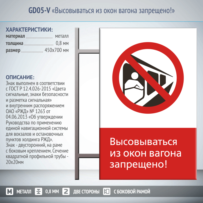 Знак «Высовываться из окон вагона запрещено!», GD05-V (двусторонний вертикальный, 450х700 мм, металл, на раме с боковым креплением) в Пушкино купить