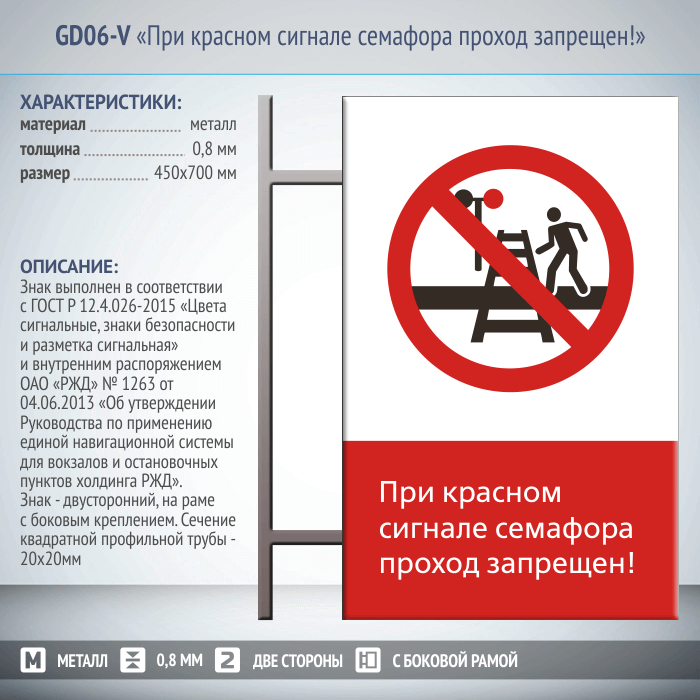 Знак «При красном сигнале семафора проход запрещен!», GD06-V (двусторонний вертикальный, 450х700 мм, металл, на раме с боковым креплением) в Пушкино купить