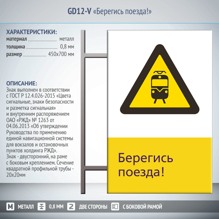 Знак «Берегись поезда!», GD12-V (двусторонний вертикальный, 450х700 мм, металл, на раме с боковым креплением) в Пушкино купить