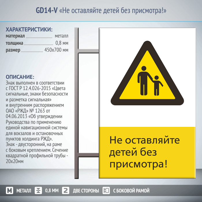 Знак «Не оставляйте детей без присмотра!», GD14-V (двусторонний вертикальный, 450х700 мм, металл, на раме с боковым креплением) в Пушкино купить