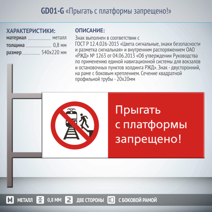Знак «Прыгать с платформы запрещено!», GD01-G (двусторонний горизонтальный, 540х220 мм, металл, на раме с боковым креплением) в Пушкино купить