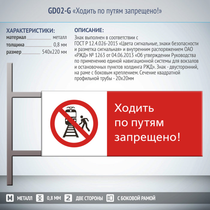 Знак «Ходить по путям запрещено!», GD02-G (двусторонний горизонтальный, 540х220 мм, металл, на раме с боковым креплением) в Пушкино купить