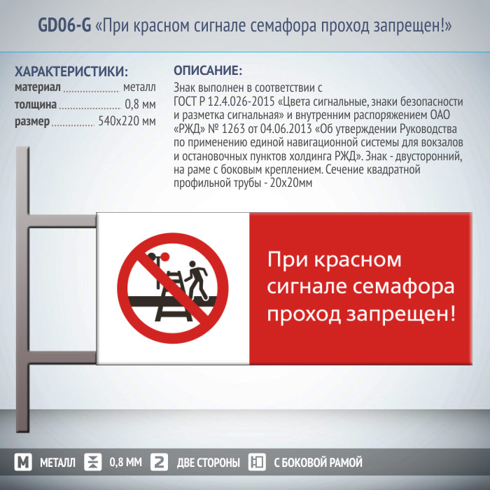 Знак «При красном сигнале семафора проход запрещен!», GD06-G (двусторонний горизонтальный, 540х220 мм, металл, на раме с боковым креплением) в Пушкино купить