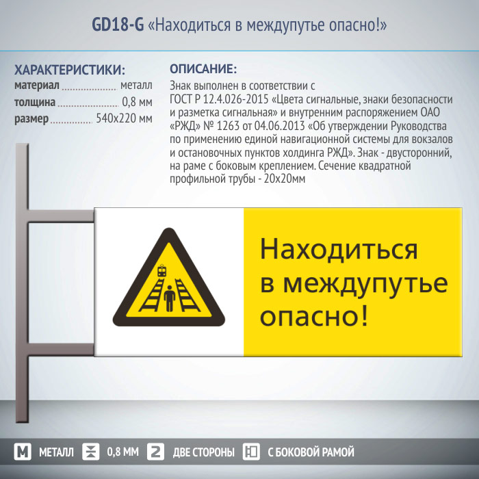 Знак «Находиться в междупутье опасно!», GD18-G (двусторонний горизонтальный, 540х220 мм, металл, на раме с боковым креплением) в Пушкино купить