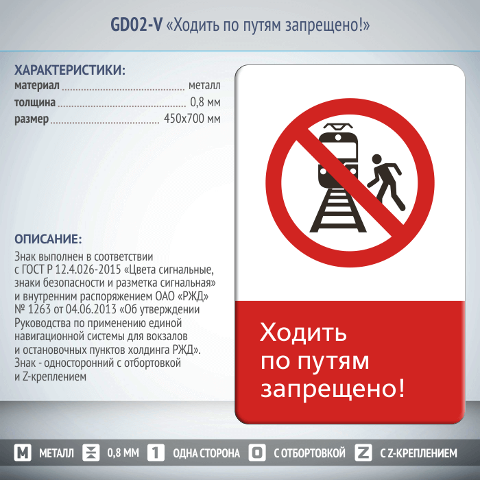 Знак «Ходить по путям запрещено!», GD02-V (односторонний вертикальный, 450х700 мм, металл, с отбортовкой и Z-креплением) в Пушкино купить