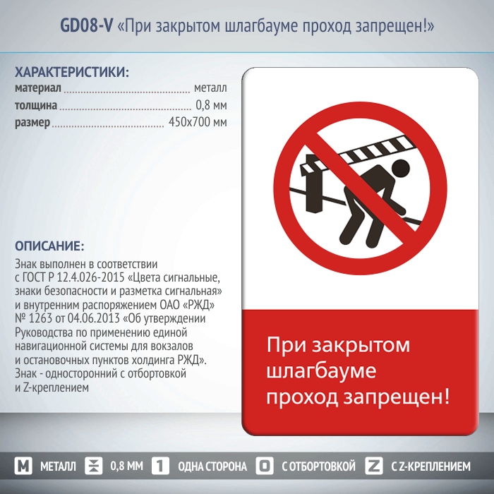 Знак «При закрытом шлагбауме проход запрещен!», GD08-V (односторонний вертикальный, 450х700 мм, металл, с отбортовкой и Z-креплением) в Пушкино купить