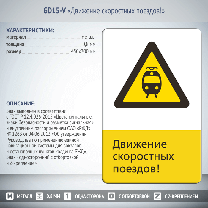 Знак «Движение скоростных поездов!», GD15-V (односторонний вертикальный, 450х700 мм, металл, с отбортовкой и Z-креплением) в Пушкино купить