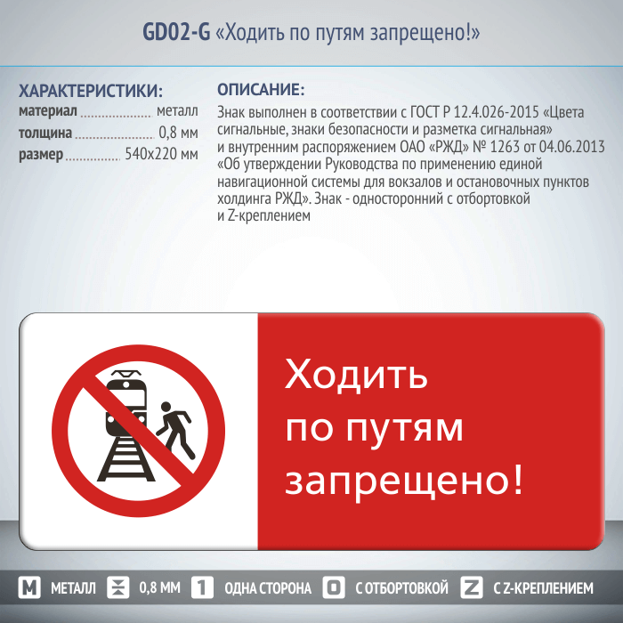 Знак «Ходить по путям запрещено!», GD02-G (односторонний горизонтальный, 540х220 мм, металл, с отбортовкой и Z-креплением) в Пушкино купить