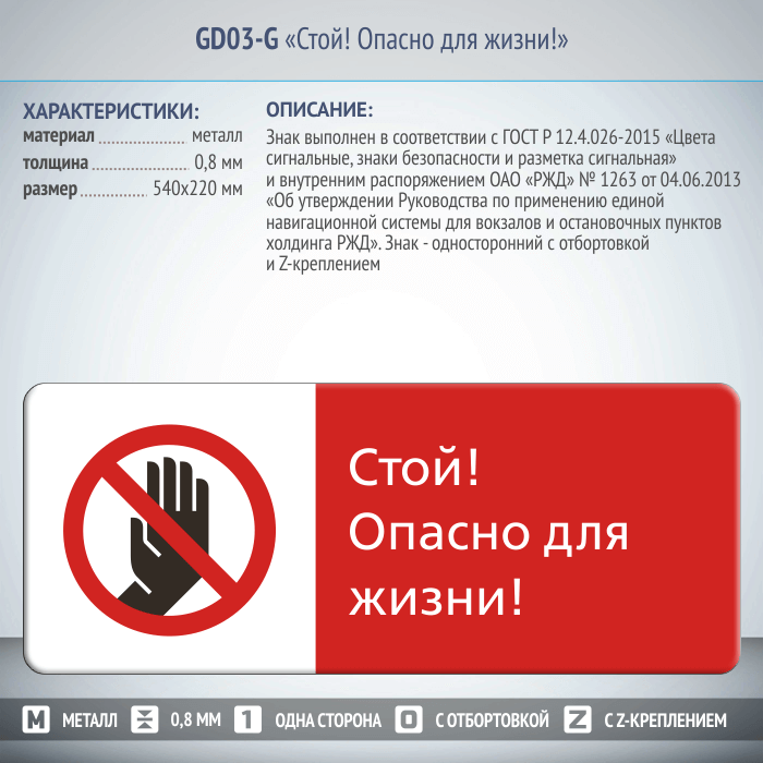 Знак «Стой! Опасно для жизни!», GD03-G (односторонний горизонтальный, 540х220 мм, металл, с отбортовкой и Z-креплением) в Пушкино купить