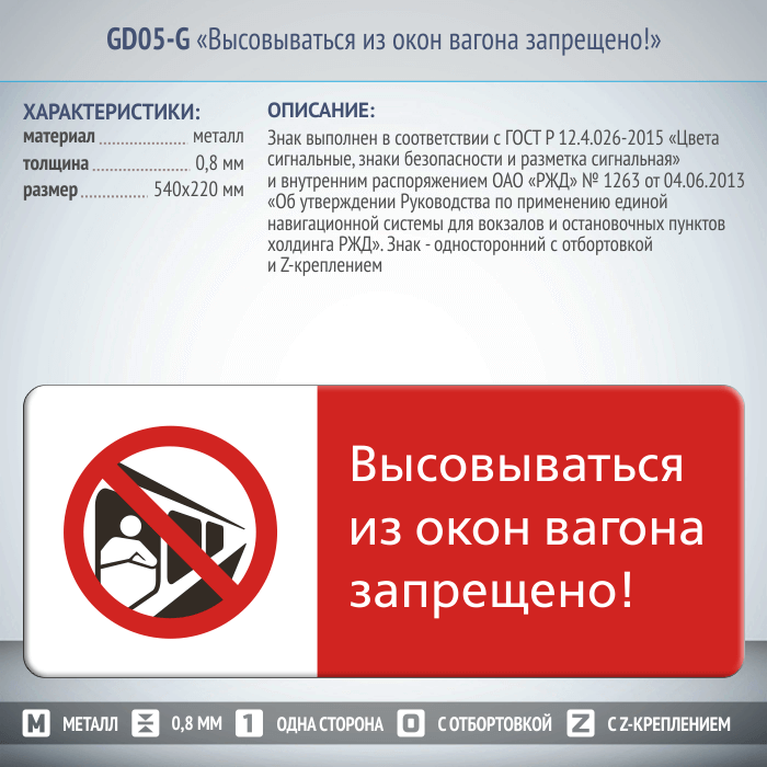 Знак «Высовываться из окон вагона запрещено!», GD05-G (односторонний горизонтальный, 540х220 мм, металл, с отбортовкой и Z-креплением) в Пушкино купить