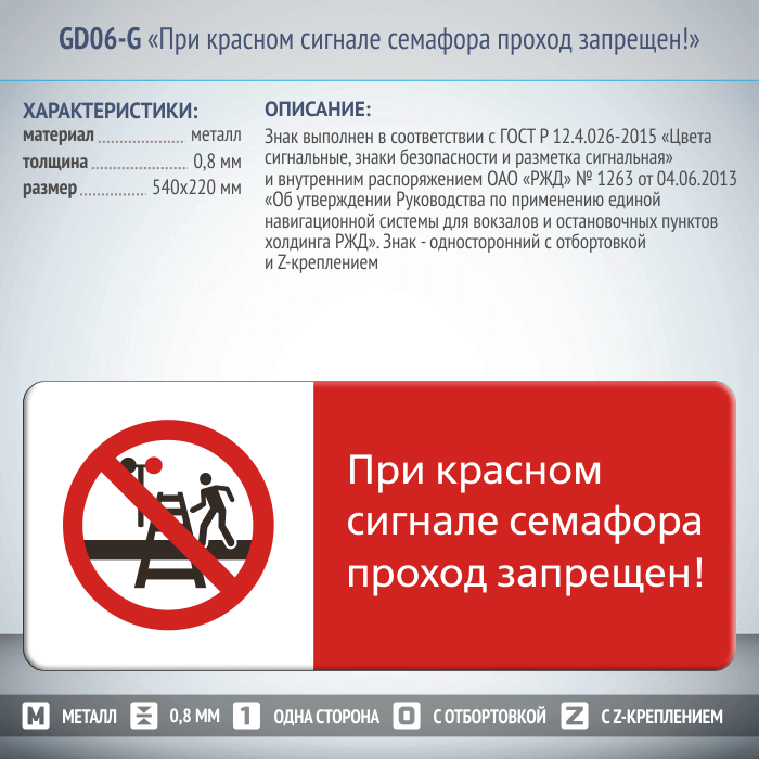 Знак «При красном сигнале семафора проход запрещен!», GD06-G (односторонний горизонтальный, 540х220 мм, металл, с отбортовкой и Z-креплением) в Пушкино купить