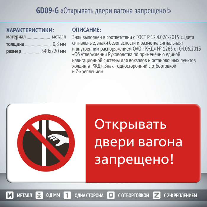 Знак «Открывать двери вагона запрещено!», GD09-G (односторонний горизонтальный, 540х220 мм, металл, с отбортовкой и Z-креплением) в Пушкино купить