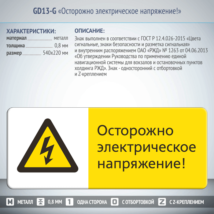 Знак «Осторожно электрическое напряжение!», GD13-G (односторонний горизонтальный, 540х220 мм, металл, с отбортовкой и Z-креплением) в Пушкино купить