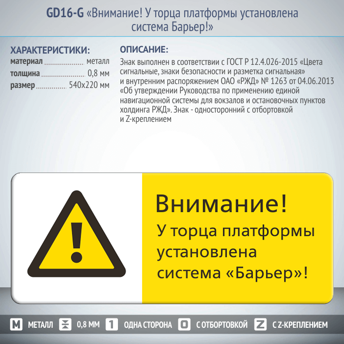 Знак «Внимание! У торца платформы установлена система Барьер!», GD16-G (односторонний горизонтальный, 540х220 мм, металл, с отбортовкой и Z-креплением) в Пушкино купить