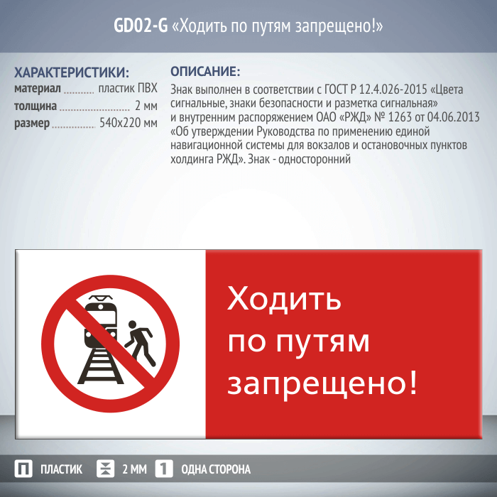 Знак «Ходить по путям запрещено!», GD02-G (односторонний горизонтальный, 540х220 мм, пластик 2 мм) в Пушкино купить