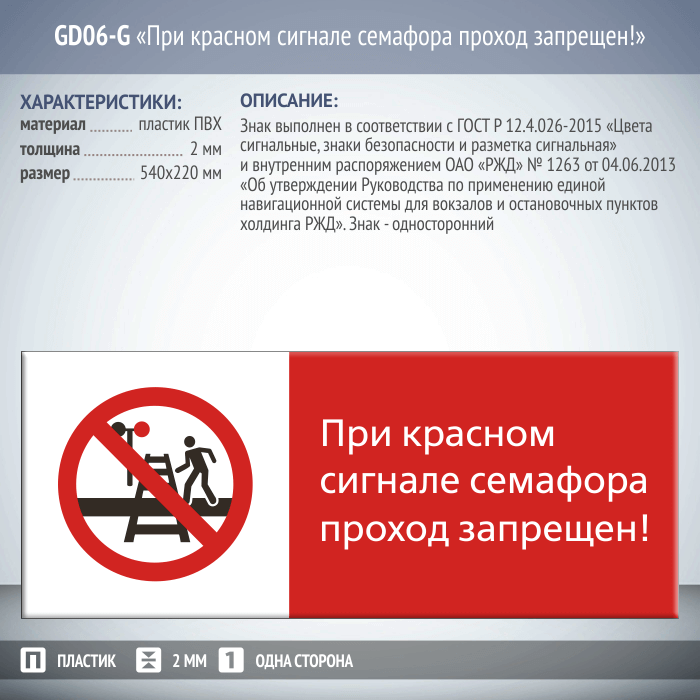 Знак «При красном сигнале семафора проход запрещен!», GD06-G (односторонний горизонтальный, 540х220 мм, пластик 2 мм) в Пушкино купить