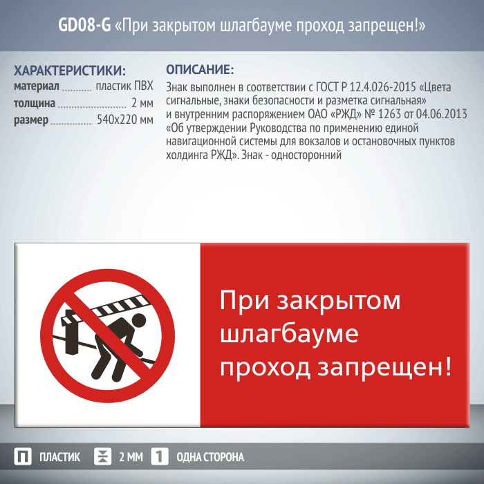 Знак «При закрытом шлагбауме проход запрещен!», GD08-G (односторонний горизонтальный, 540х220 мм, пластик 2 мм) в Пушкино купить